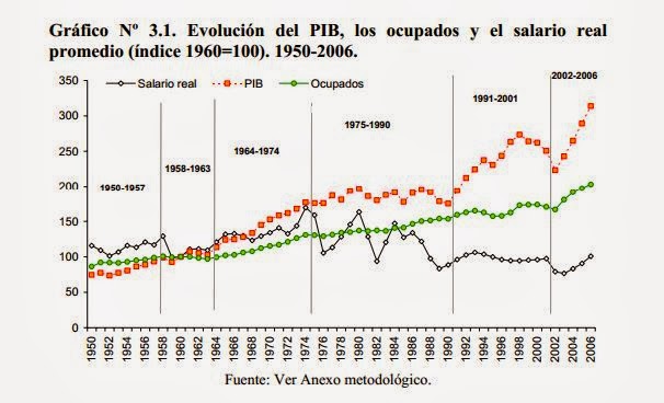 Una consecuencia directa del comportamiento de la tasa de ocupación y subocupación y de la inflación es la evolución de los salarios, especialmente del salario real, que es el verdadero poder de compra del mismo. La historia del salario real promedio en el largo plazo (1950/2006) fue la siguiente: