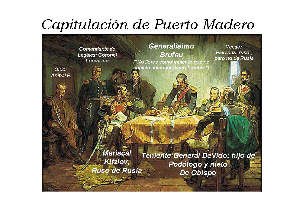 Por último, atusándose el mostacho, el Teniente General DeVido sonreía satisfecho mientras relataba pormenores de las acciones que condujeron a la Capitulación: «Se rindieron sin disparar un tiro, con unos mangos los arreglamos«.