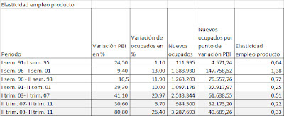 - En el cuadro 1, se observa que entre el primer semestre de 1991 y el primer semestre de 1995, la elasticidad fue de 0,04, esto indica que un incremento de 1% en el producto generaba un aumento de 0,04% en el empleo. Lo cual refleja que durante la primera parte de la convertibilidad se consolidó un verdadero modelo de crecimiento sin desarrollo económico, por cuanto el crecimiento del producto no fue acompañado por el crecimiento en el empleo.