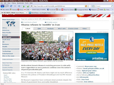 En efecto, la leyenda de la foto recortada de la BBC dice “Supporters of Mir Hossein Mousavi again defied a ban on protests”, es decir, “Los partidarios de Mir Hossein Mousavi otra vez desafiaron una prohibición de protestas”. ¡Ploink! Los milagros del Photochot.